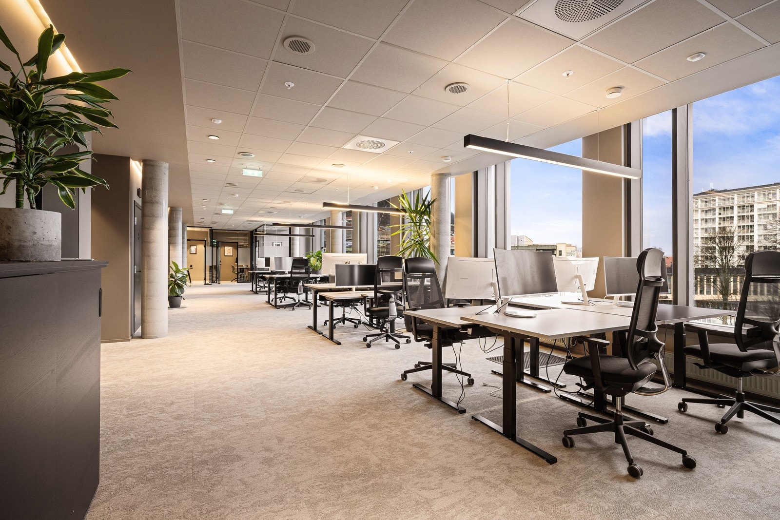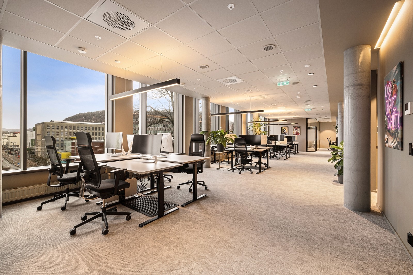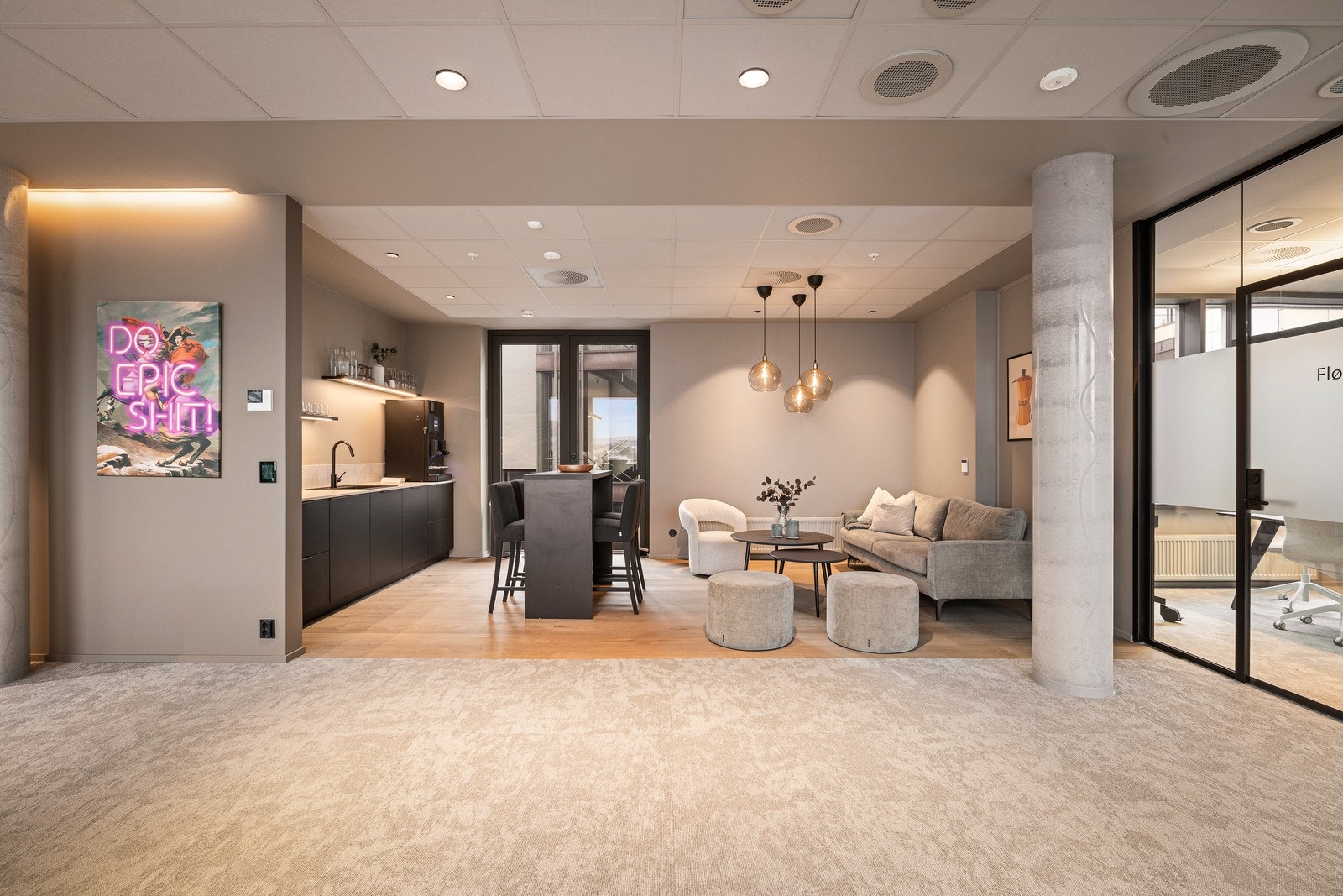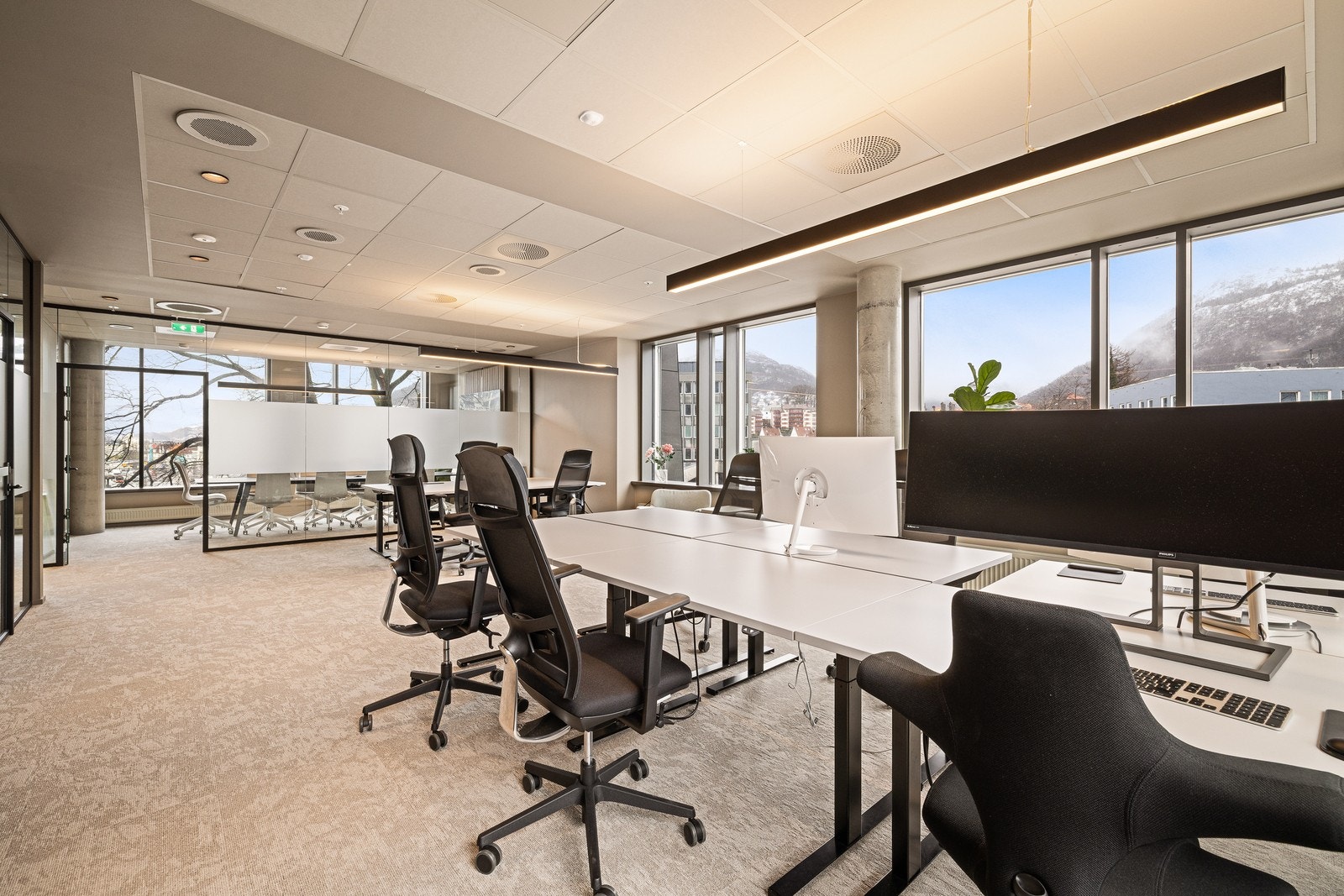 Her tilbys lyse og innbydende arbeidsomgivelser med gjennomgående høy kvalitet i materialvalg og utførelse. Lokalene er innredet med en kombinasjon av åpent landskap, møterom og støtterom – ideelt for virksomheter som ønsker effektive, representative og inspirerende arbeidsflater.