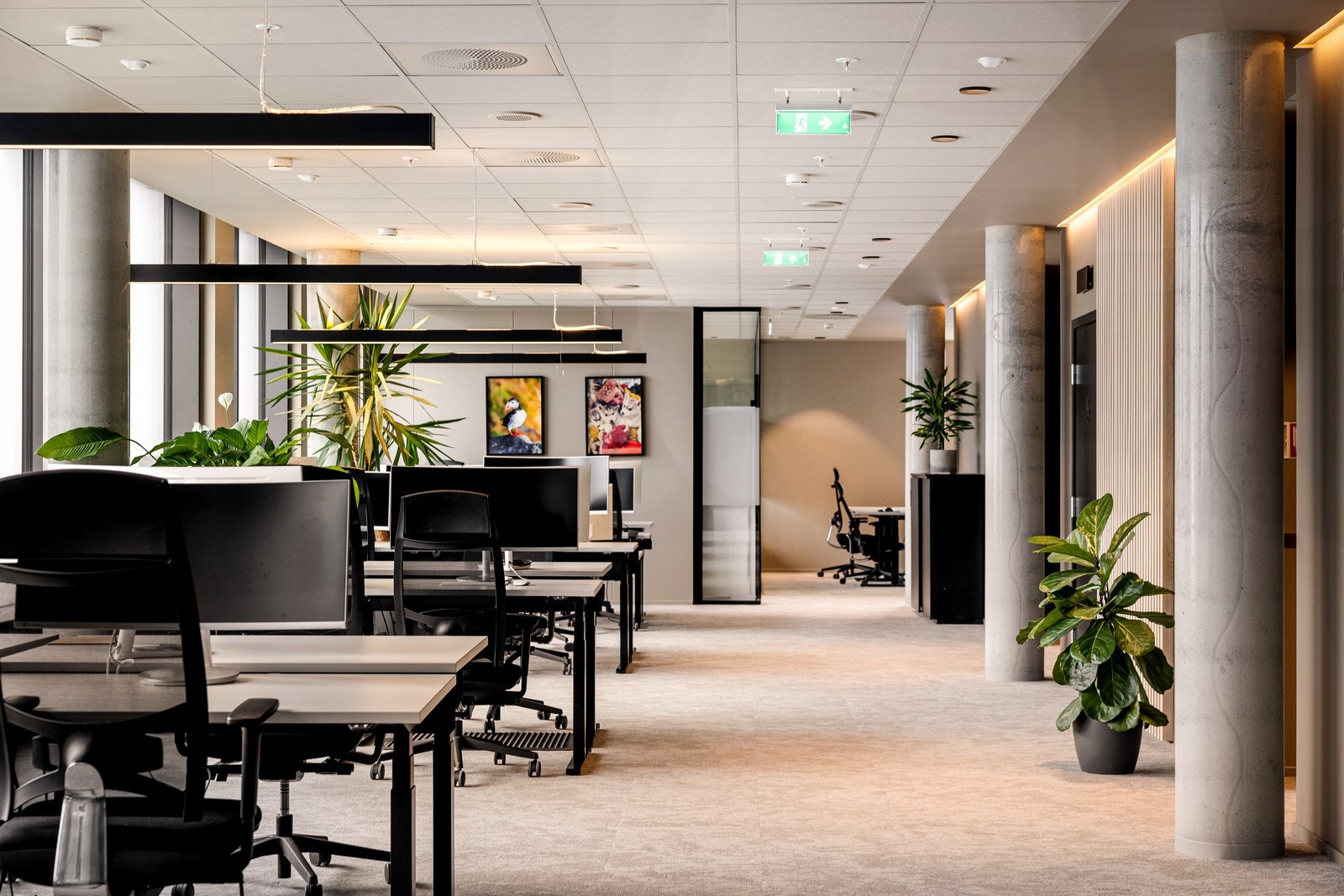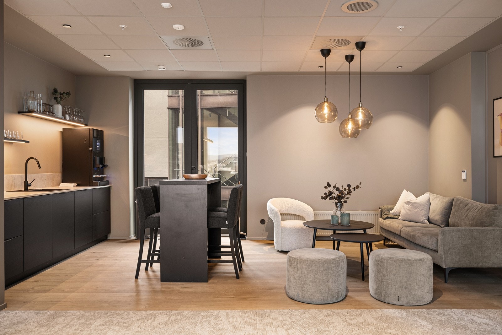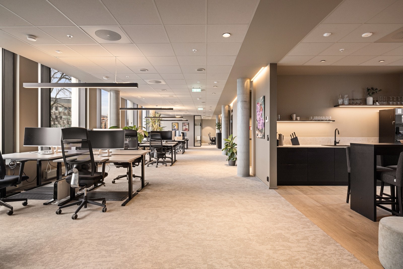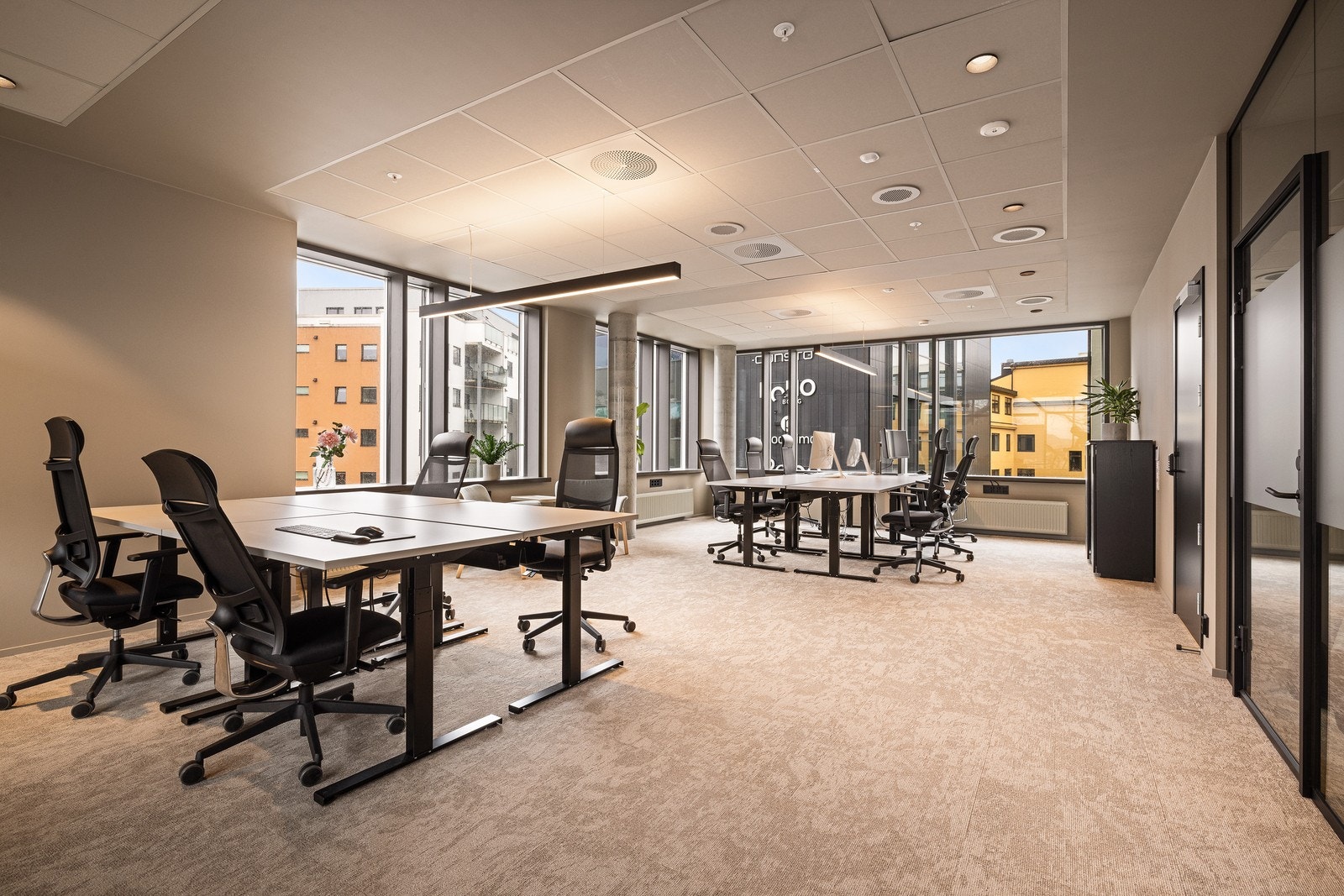 Her tilbys lyse og innbydende arbeidsomgivelser med gjennomgående høy kvalitet i materialvalg og utførelse. Lokalene er innredet med en kombinasjon av åpent landskap, møterom og støtterom – ideelt for virksomheter som ønsker effektive, representative og inspirerende arbeidsflater.